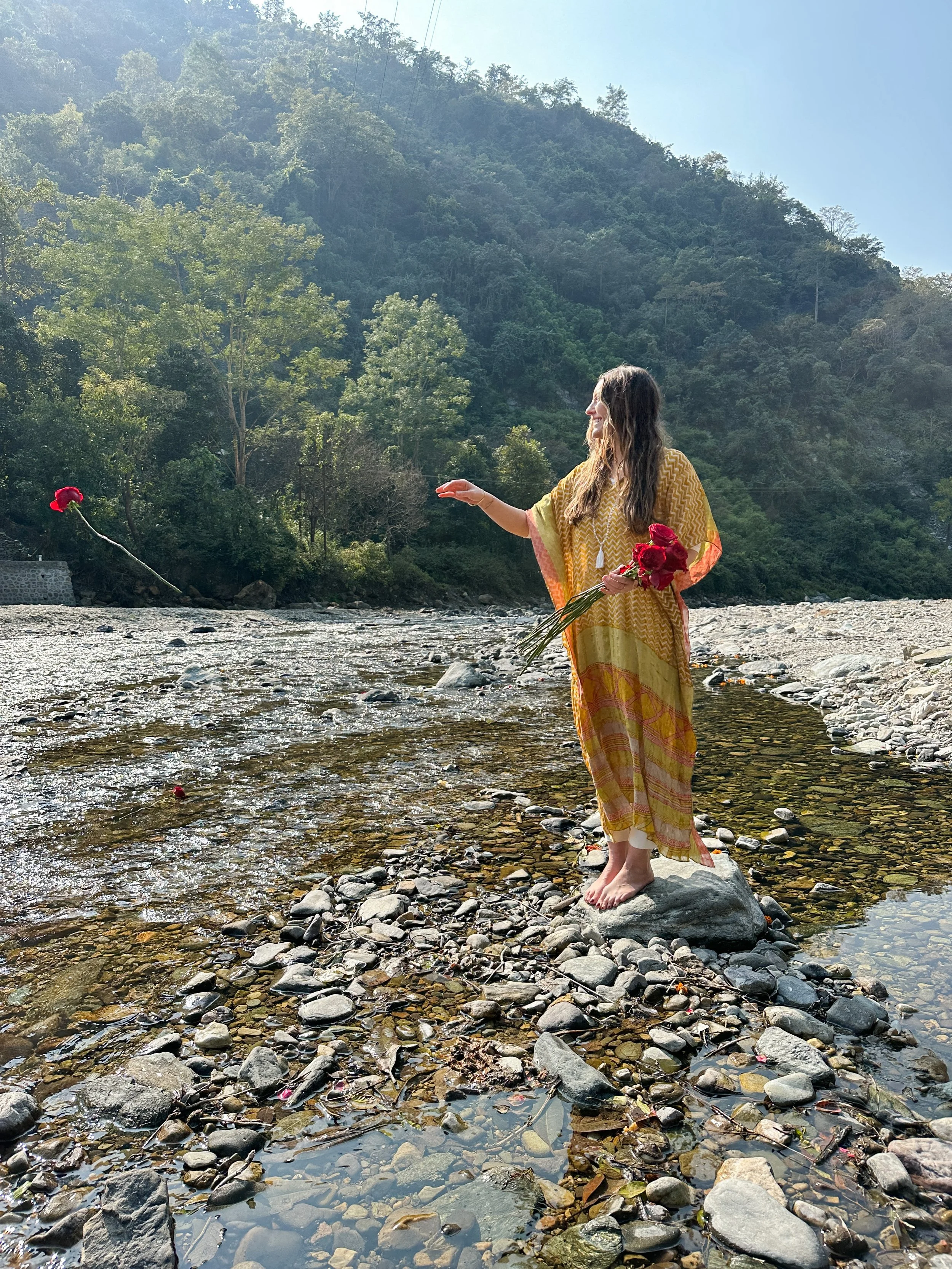It’s traditional that we swaha flowers into the Ganges River as an offering.